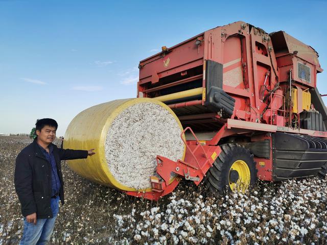 自治区农机局提供数据显示,据不完全统计,今年年底,新疆植保无人机将突破5000架,累计作业面积达4000万亩次。六行采棉机不停车采摘还能“下蛋”现场见闻一次能采6行棉花,采净率超过95%,机箱自重30吨。更令人惊奇的是,这台六行采棉机还能“下蛋”。记者观察到,这台进入生产阶段的采棉机,机身是红色的,前排有六组像大铲子似的采棉板。作业时,机器发出巨大的轰鸣声,一排排棉花被收割,采集到的白色棉花一层被包裹在黄色塑料薄膜中,隔800米就会变成一个重达2200公斤的“棉花蛋”。